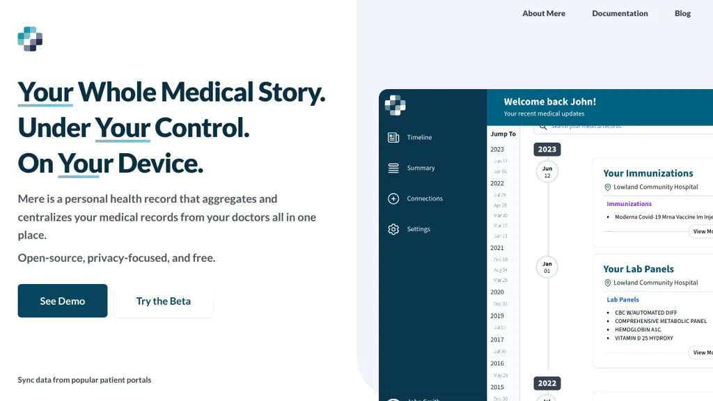 Mere Medical is a self-hosted personal health record (PHR) web application that aggregates and syncs medical records from multiple patient portals into a single timeline and summary interface. It is designed to be local-first and privacy-focused so core functionality can work offline and data can be stored and controlled by the user.