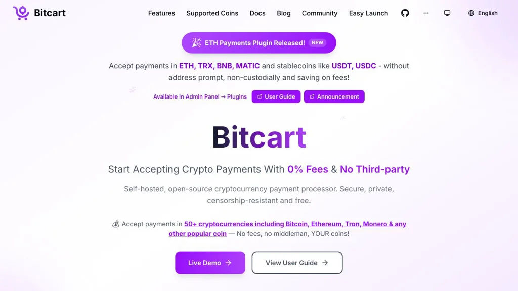 Bitcart is a self-hosted, open-source payment processor for accepting cryptocurrency and token payments. It is designed to be non-custodial, sending funds directly to merchant-controlled wallets without requiring private keys.