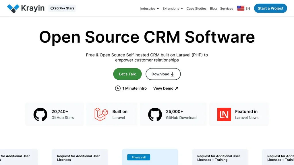 Krayin CRM is an open-source customer relationship management platform designed for SMEs and enterprises. Built on Laravel (PHP) with a Vue.js frontend, it provides modular CRM capabilities for sales, marketing, support and integrations.