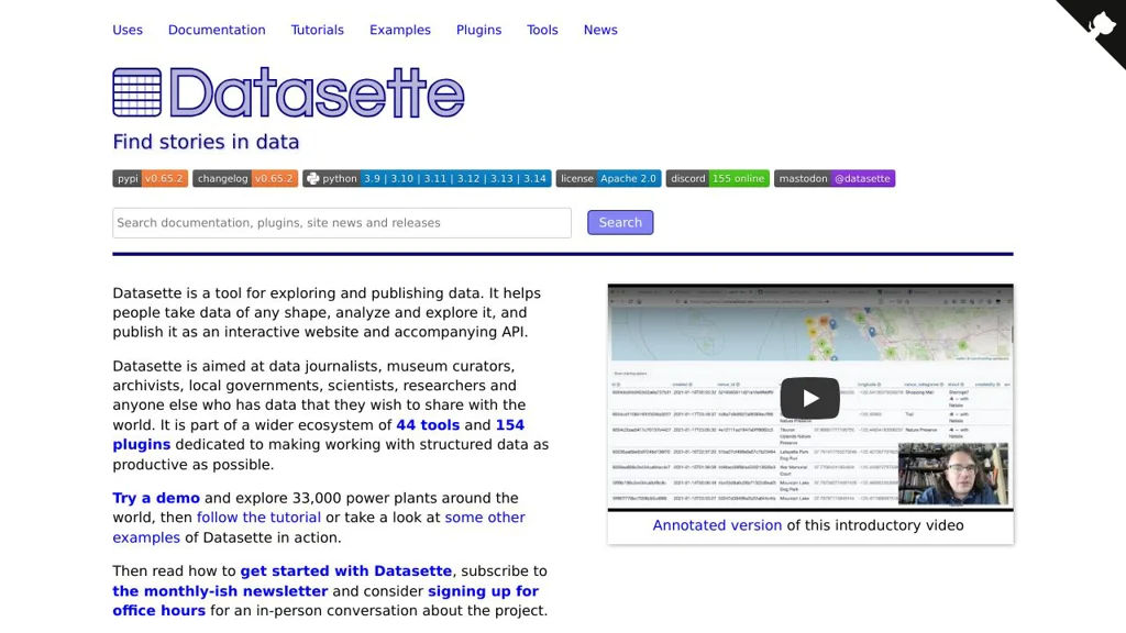 Datasette is an open source tool for exploring and publishing data, turning SQLite databases into an interactive website with a built-in JSON API. It is designed to help share, browse, and query datasets in a user-friendly way, while remaining extensible through plugins.