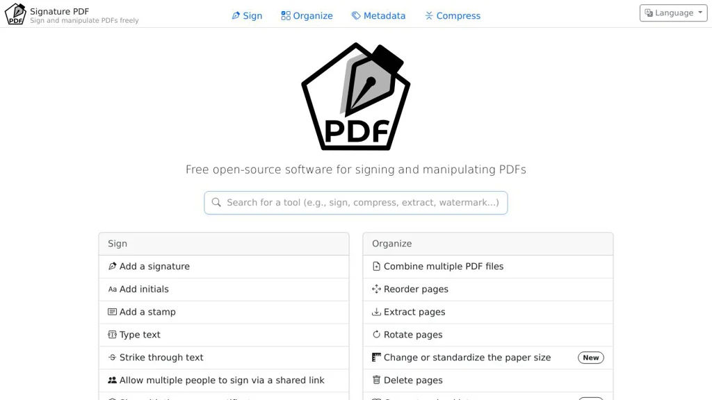 Signature PDF is well-suited for organizations that need a lightweight, browser-based PDF signing and editing workflow. It combines signing, page management, metadata editing, and compression in a single self-hostable interface.