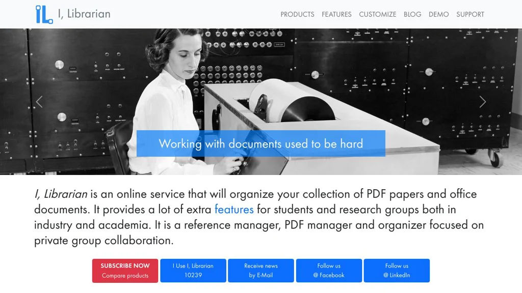 I, Librarian is a web-based application for organizing, annotating and sharing collections of PDF papers and office documents. It targets individual researchers and small-to-medium research groups, providing centralized storage, in-browser PDF annotation and advanced full-text search including OCR support. (i-librarian.net)