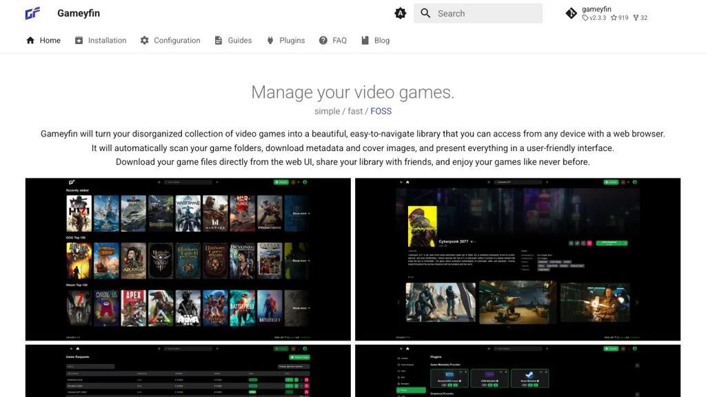 Gameyfin organizes your video game collection into a searchable web library with automatic scanning, metadata fetching, downloads, sharing, and optional SSO integration.
