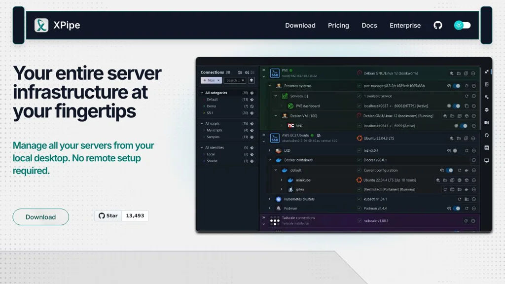 XPipe is a desktop connection hub and remote file manager that centralizes access to SSH hosts, containers, virtual machines and Kubernetes clusters from a single local application. It integrates with your existing command-line tools and editors, provides a terminal launcher and a file browser, and can synchronize connection data across systems via a git repository.