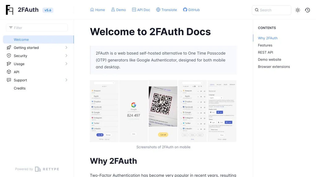 2FAuth is focused on providing a standards-compliant, auditable, and UI-friendly way to manage OTP-based 2FA tokens for desktop and mobile web access. It emphasizes privacy, portability of data, and flexible deployment options.