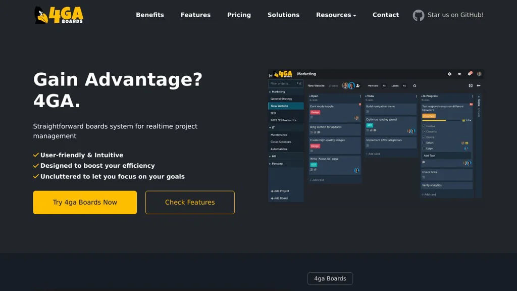 4ga Boards is an open-source, realtime Kanban-style board system for team project and task management. It provides a minimal, wide-screen web interface with realtime updates, multitasking tools, and an advanced Markdown editor for card descriptions.
