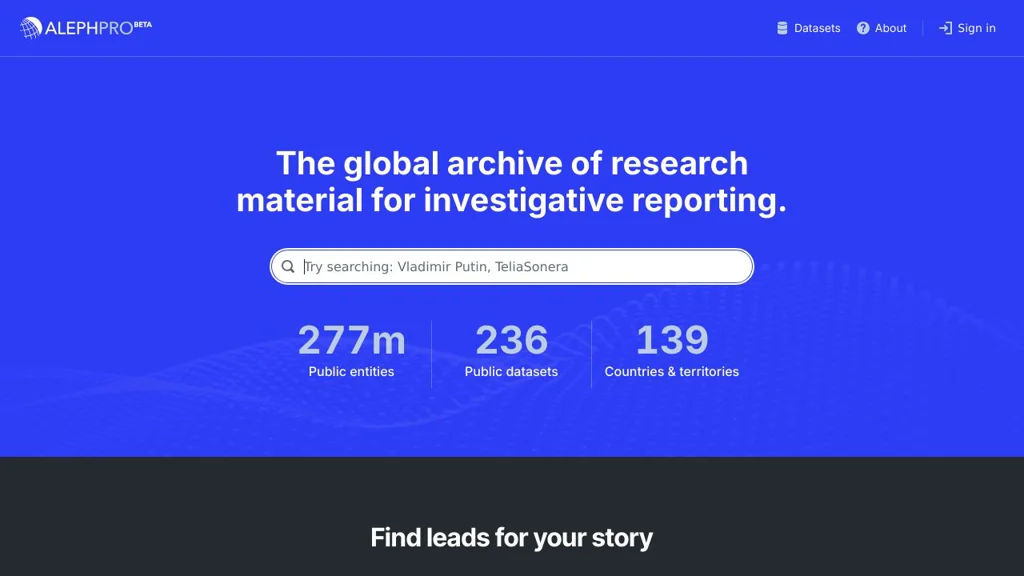 Aleph is an investigative data platform for ingesting and indexing large collections of documents and structured datasets, making them searchable and easier to analyze. It is designed to help researchers find people, companies, and connections across many sources, including watchlists and prior research.