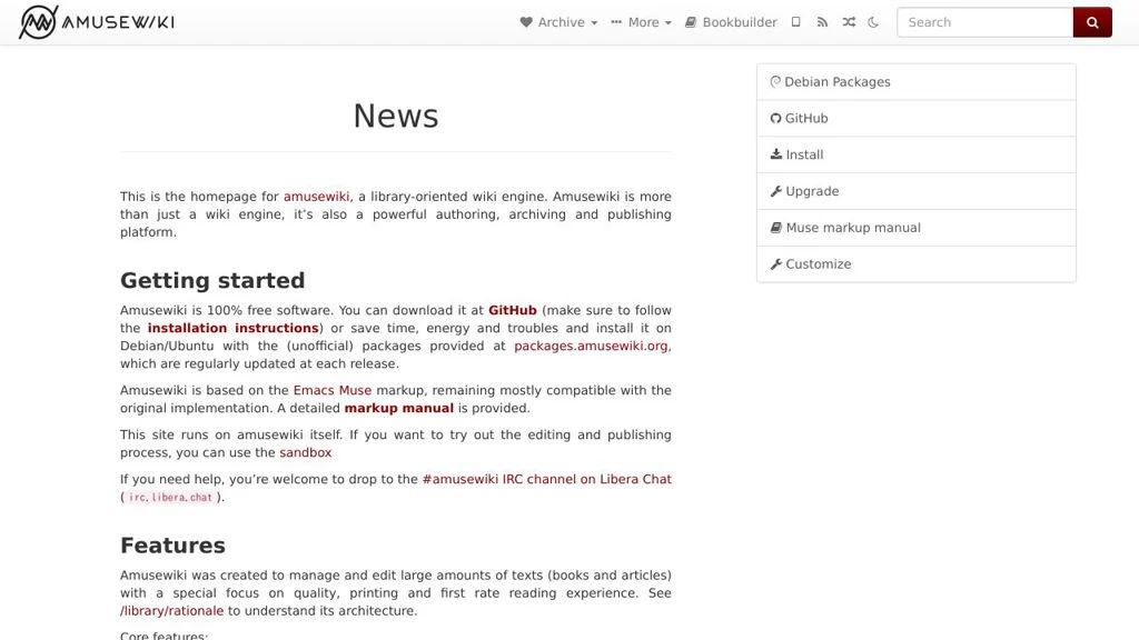 - The project provides Debian packages and traditional server deployment guidance; official Docker images are not provided in the main repository (third-party Docker projects exist). (packages.amusewiki.org)