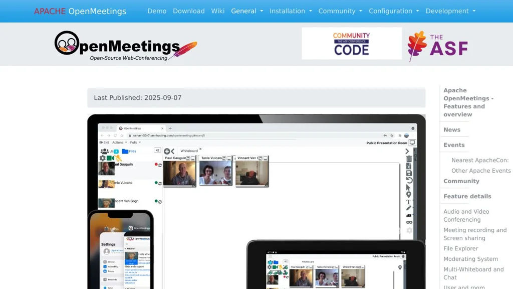 Apache OpenMeetings is an open source web conferencing and groupware platform for running online meetings in the browser. It combines real-time audio/video, chat, whiteboards, and file collaboration with administrative controls for users, rooms, and organizations.