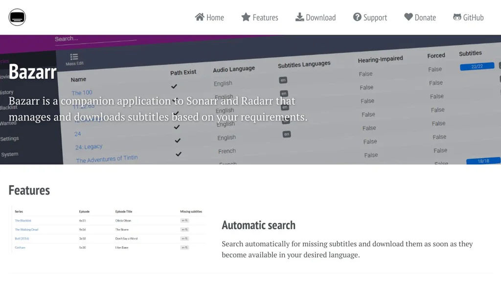 Bazarr is well-suited for media automation stacks that rely on Sonarr and Radarr and want reliable, hands-off subtitle acquisition and upkeep. It combines automation with manual controls to handle edge cases when matching is difficult.