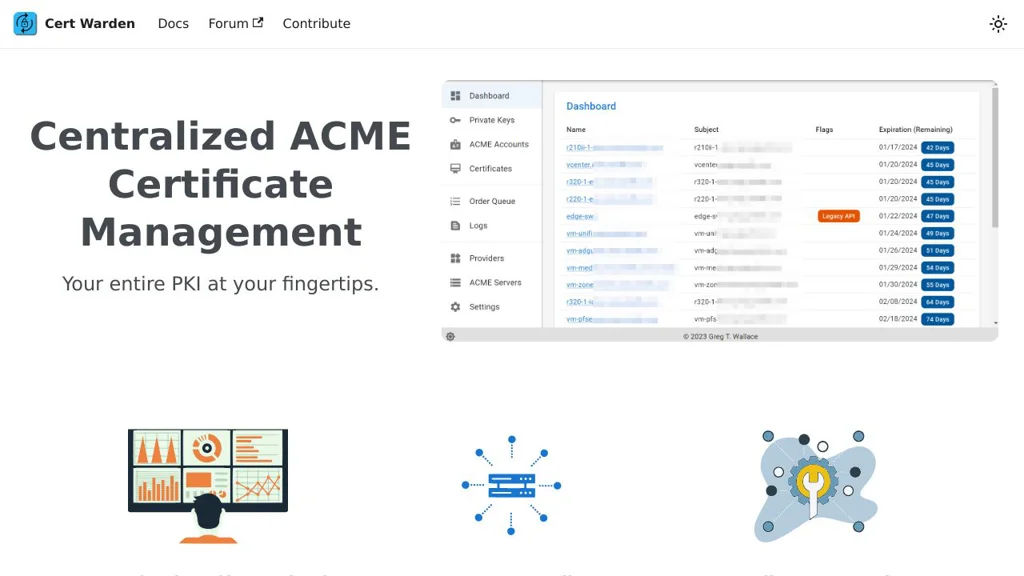 Cert Warden is a centralized ACME client that provides a REST API and web UI to create, manage, and automatically renew TLS certificates. It centralizes ACME account handling and exposes a scoped API-keyed GET interface so consumers can fetch individual keys and certificates without implementing ACME themselves.
