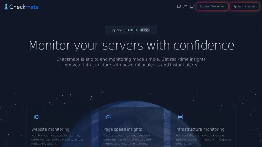 Checkmate is an open-source monitoring application for tracking website and service uptime, response times, and operational incidents. It also supports deeper infrastructure visibility (CPU, RAM, disk, temperatures) via an optional remote agent.
