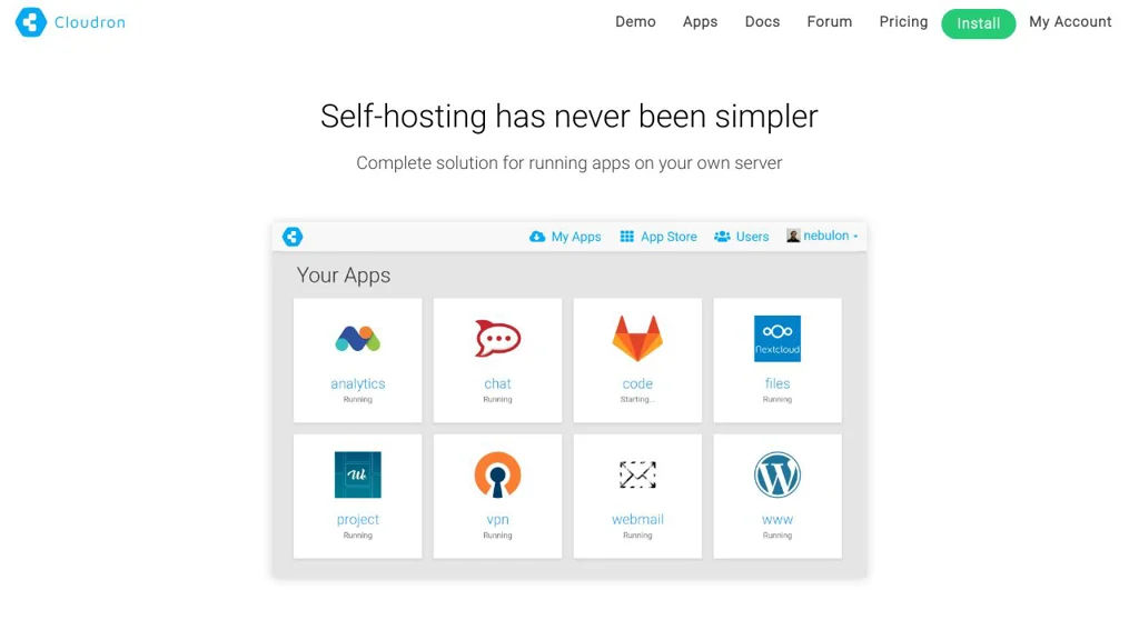 - One-click app installs from a curated Cloudron App Store (packaged apps)