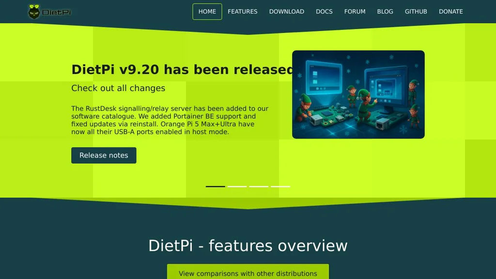 DietPi is an extremely lightweight Debian-based operating system optimized for single-board computers and small x86_64 systems. It focuses on minimal CPU/RAM usage while providing a streamlined, menu-driven experience for setup and ongoing management.