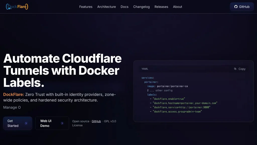 DockFlare is a self-hosted ingress controller for Cloudflare that automates Cloudflare Tunnel configuration from Docker container labels. It centralizes DNS and Cloudflare Zero Trust Access management, and includes a web UI for manual definitions and policy overrides.