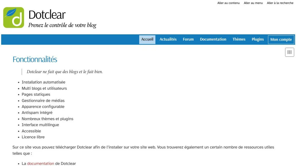 Dotclear is an open-source web-publishing and blogging engine written in PHP designed for easy publication and flexible theming. It targets individual bloggers and small to medium multi-user/multiblog sites, offering a user-friendly admin, extensibility via plugins and themes, and support for multiple databases.