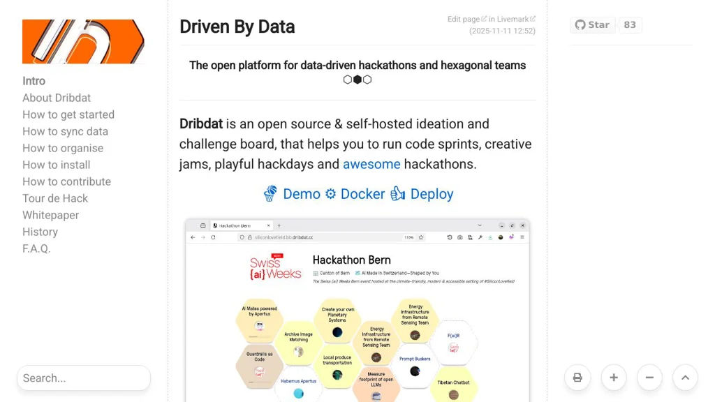 Dribdat is an open-source, self-hosted platform for organising data-driven hackathons, ideation sprints and challenge boards. It provides a lightweight web frontend and API for announcing events, publishing challenges, forming teams and curating project outcomes.