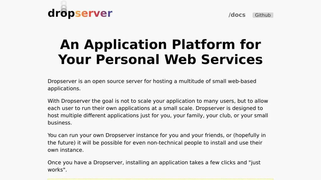 Dropserver is a developer-friendly platform focused on giving users control over small web apps and their data. It is suitable for technically inclined users who want a lightweight, sandboxed environment to build and share personal web services.