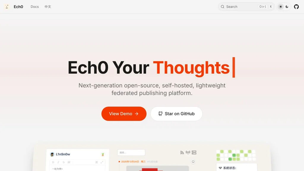 Ech0 is a compact, open-source self-hosted platform for publishing short posts, notes and links. It focuses on low resource usage, fast deployment and federated connectivity so individuals can publish and share while keeping data locally controlled.