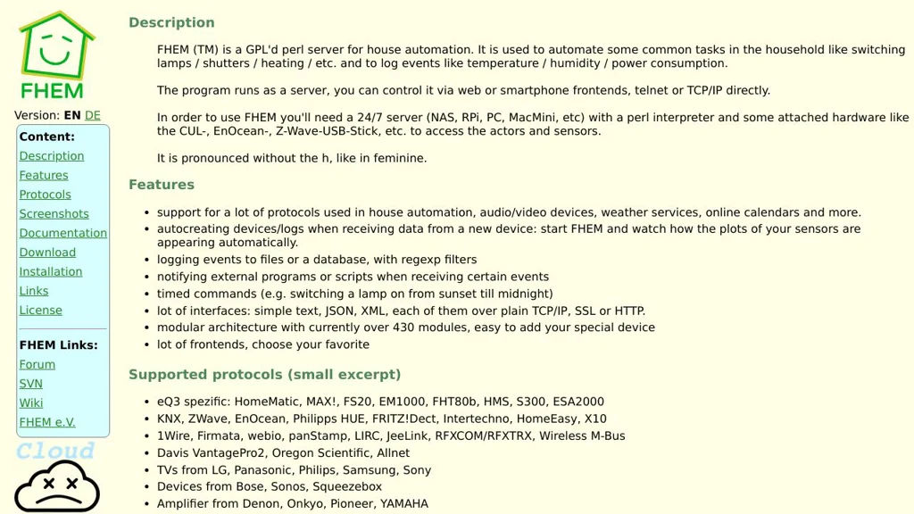 FHEM is an open-source Perl-based server for home automation. It runs as a background service and provides device control and monitoring via built-in web frontends, smartphone apps, telnet, or TCP/IP. It supports a wide range of hardware protocols through a modular collection of modules.