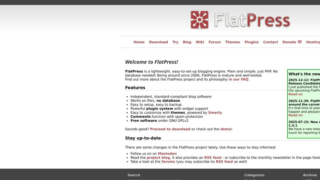 FlatPress is a mature, minimal blogging platform that favors simplicity and portability over enterprise features. It is well suited for low- to moderate-traffic blogs and sites where ease of setup and file-based backups are important.