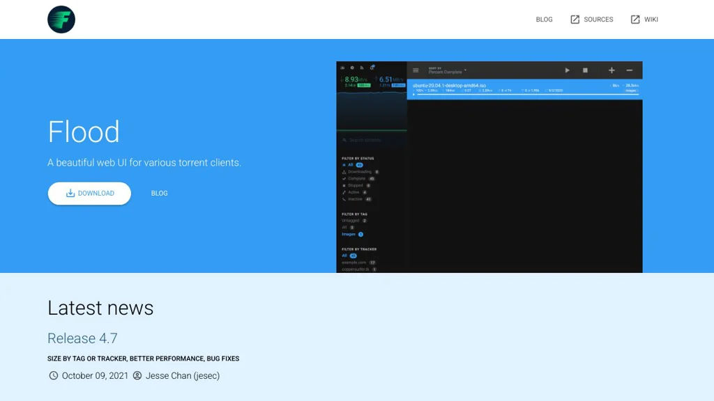 Flood is a monitoring and administration service for popular torrent clients, providing a modern web interface backed by a Node.js server. It connects to your existing torrent client and exposes an easy-to-use UI for day-to-day control and status tracking.