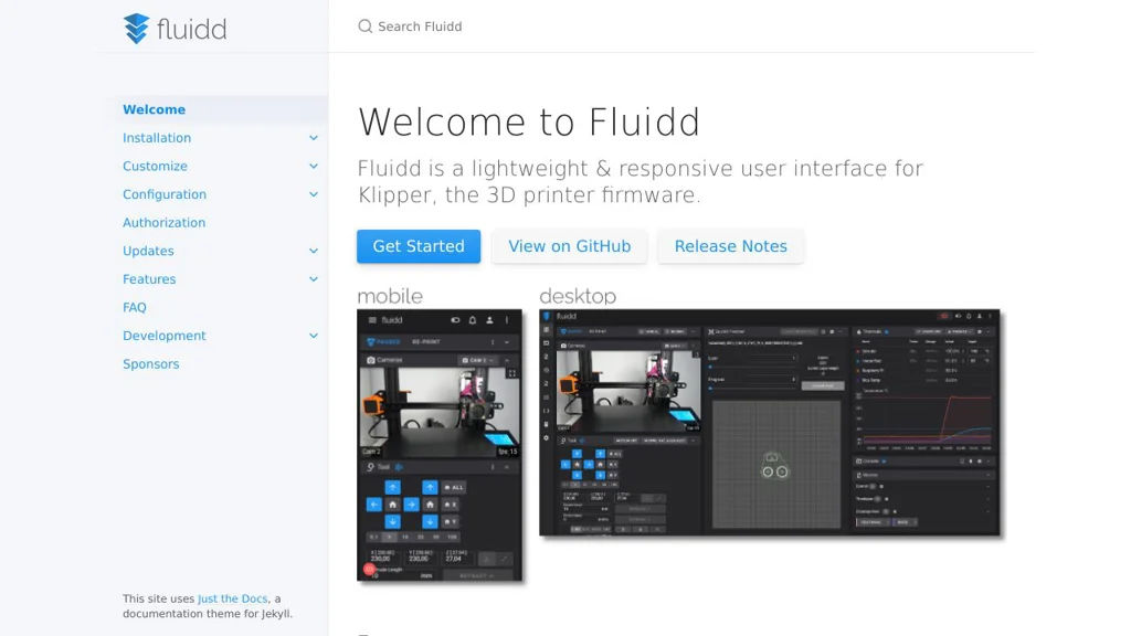 Fluidd is a lightweight, responsive web interface for Klipper-based 3D printers. It connects through Moonraker to provide day-to-day printer control, monitoring, and configuration in a modern browser UI.