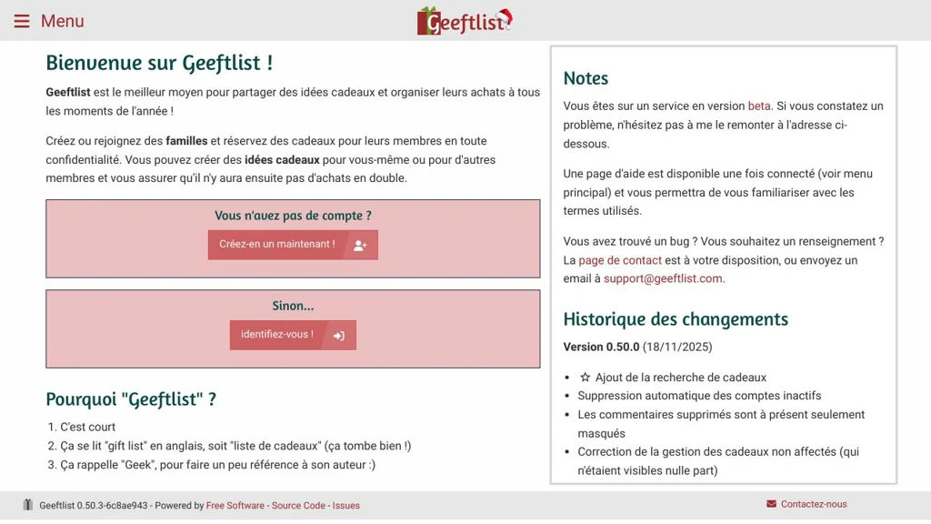 Geeftlist is actively maintained with regular version releases and changelogs documenting feature additions and upgrades. It is suitable for groups and small communities that want a focused, open-source solution for collaborative gift list management.