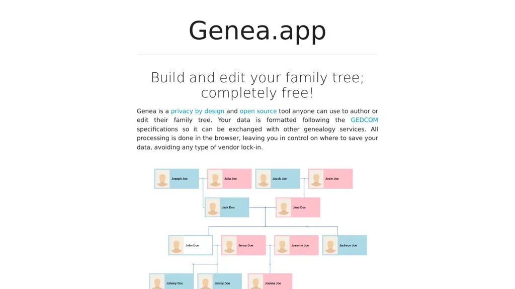Genea is a client-side web application for visually building and editing family trees. It consumes and produces GEDCOM-format genealogy data and performs all processing in the browser so users control where files are stored.