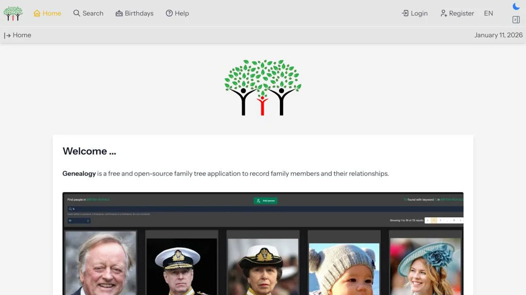 Genealogy is an open-source family tree application for recording people, relationships, events and media. It is built on the TALL stack and designed for multi-tenant team use with role-based permissions.