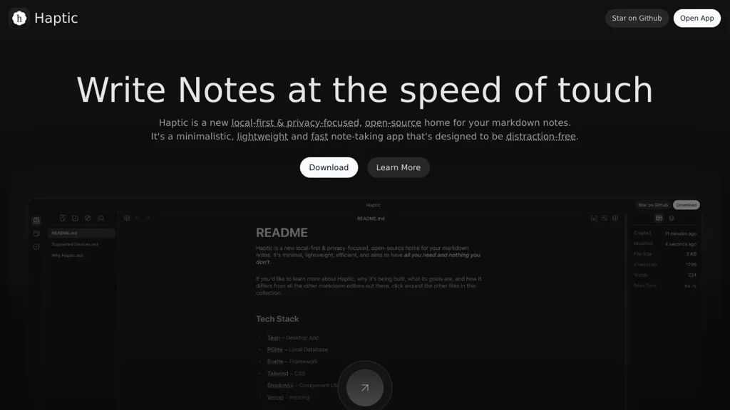 Haptic is a minimal, local-first markdown note-taking application designed around privacy and speed. It provides a lightweight, distraction-free editor for personal notes with both a web-hosted interface and a native desktop wrapper.