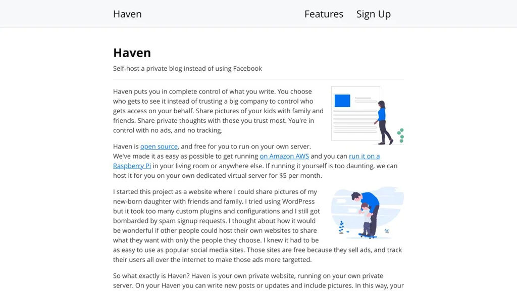 Haven is a privacy-first, self-hosted private blog application designed for sharing with a limited audience. It is implemented as a Ruby on Rails web application and provides a web interface for writing, user management, and reading feeds. (github.com)
