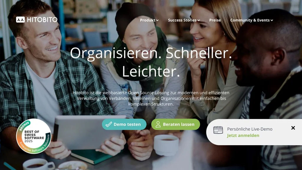 Hitobito is an open-source web application for managing organizations and communities with complex group hierarchies. It provides contact and member management, event and course administration, mailings, invoicing and role-based permissions in a plugin-oriented architecture. (hitobito.com)