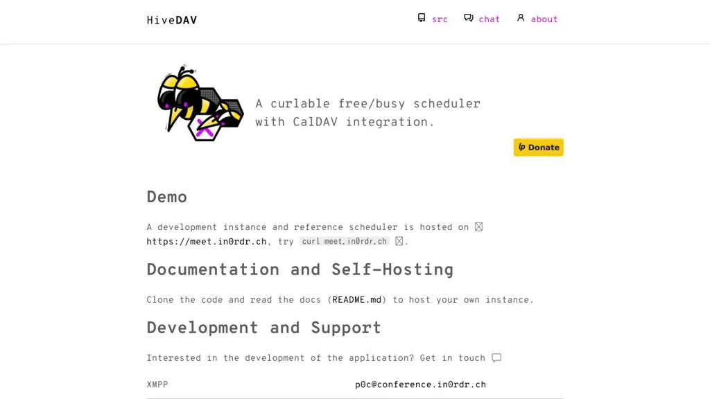 HiveDAV is a small, curlable free/busy scheduler that reads availability from a CalDAV calendar, stores it locally, and exposes a simple HTTP (curl) interface for availability and booking. It is designed to be run as a standalone service and is configured via environment variables. (hivedav.p0c.ch)