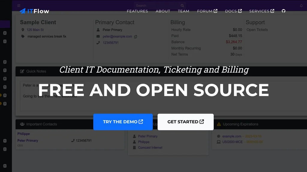ITFlow is an all-in-one Professional Services Automation (PSA) platform for managed service providers (MSPs). It centralizes client documentation, support ticketing, and billing/accounting in a single web application, with an included client portal.