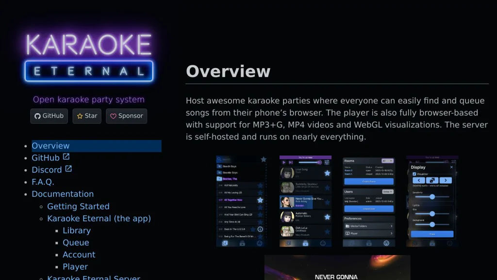 Karaoke Eternal is a practical, party-focused karaoke system that combines a simple mobile queue experience with a capable browser player. It’s a good fit when you want control over your media library and a smooth guest experience without relying on third-party services.