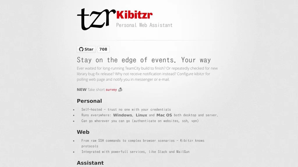Kibitzr is a self-hosted personal web assistant that watches web pages for changes and notifies you when something happens. It emphasizes privacy and local control, with configuration defined in a single YAML file and support for multi-platform execution.
