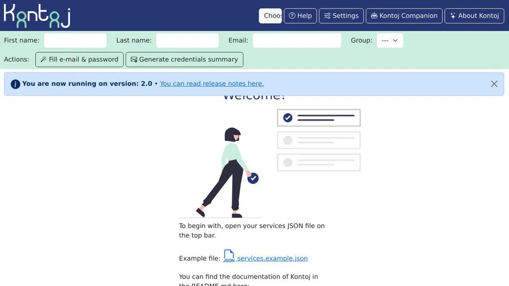 Kontoj is a lightweight web tool that helps create accounts on web services from a structured JSON file. It reads a services.json definition, generates passwords and emails, and assists with navigation and form autofill using a companion userscript.