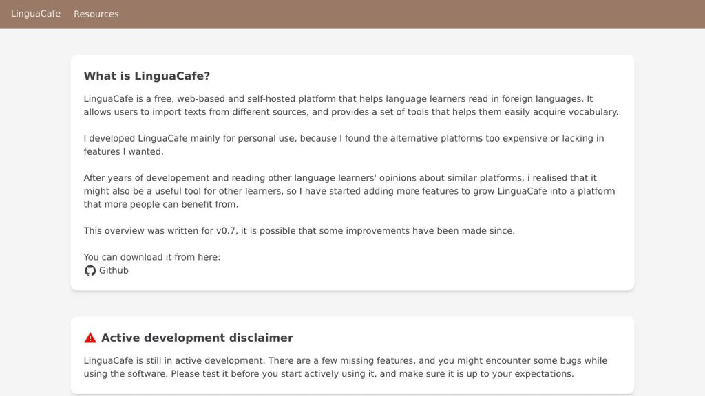 LinguaCafe is a self-hosted web application that helps language learners read foreign-language content while building vocabulary. It combines an in-browser reader with fast word lookup, vocabulary tracking, and review tools designed to reduce friction during extensive reading.