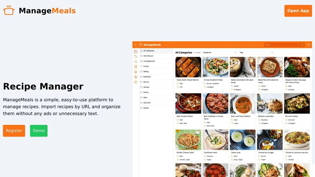 ManageMeals is an open-source web application for collecting, organizing and using recipes. It provides URL-based recipe import, a fast searchable interface, meal planning and shopping list generation. The frontend is built with SvelteKit and pairs with a separate backend service.