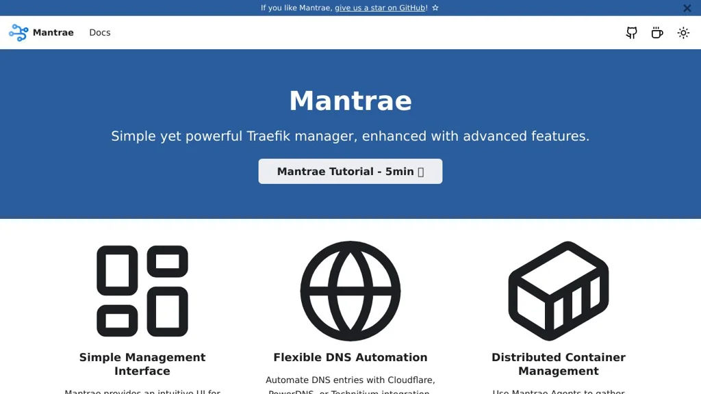 Mantræ is intended for teams that want a UI-first approach to building Traefik dynamic configuration and automating DNS. It simplifies repetitive configuration tasks while leaving Traefik as the runtime reverse proxy.