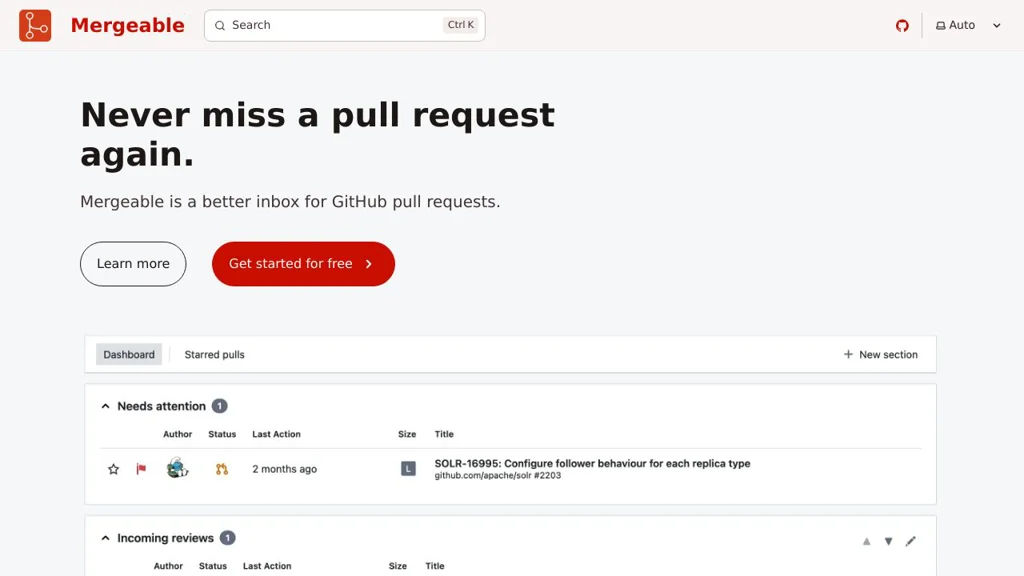 Mergeable is a client-side application that provides a focused inbox and dashboard for managing GitHub pull requests. It organizes PRs into configurable sections and surfaces items that need attention, while running primarily in the browser.