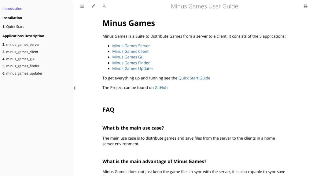 Minus Games is a self-hosted suite for distributing, running and syncing games from a central home server to client devices. It provides server and client components plus helper apps to discover, update and launch games while keeping game files and save data synchronized.