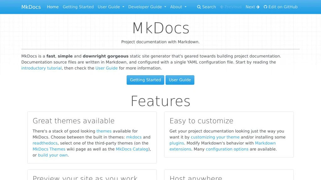 MkDocs is a good fit when you want a straightforward documentation workflow with minimal setup, while still having an ecosystem of themes and plugins to extend functionality. Because it produces static output, it is easy to deploy and run on a wide range of infrastructure.