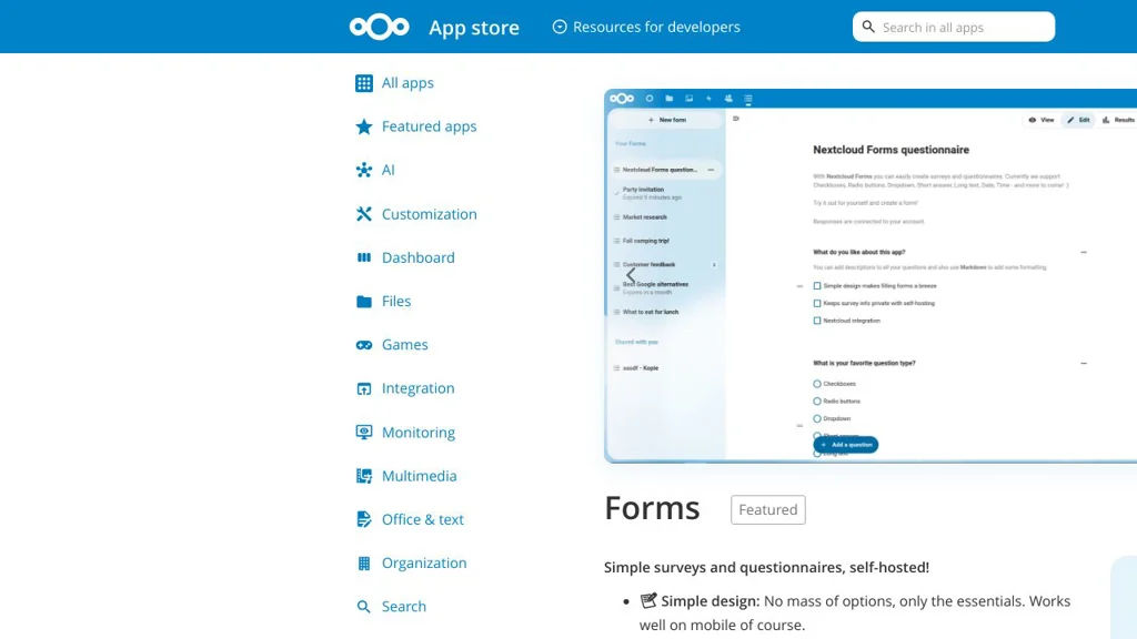 Nextcloud Forms is a Nextcloud application for creating surveys, questionnaires and simple forms. It provides a mobile-friendly form builder and response viewer that stores form definitions and responses on the host Nextcloud instance.
