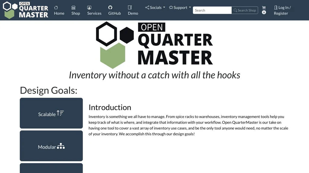 Open QuarterMaster is an open-source inventory management system designed to be simple to use while remaining powerful and extensible. It centers on a Core API for generic inventory functions and a web-based Base Station frontend, with additional functionality provided by optional plugins.