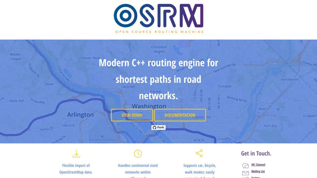 Open Source Routing Machine (OSRM) is a high-performance routing engine written in C++ that computes routes on OpenStreetMap data. It provides a production-oriented HTTP API and can also be used as a C++ library or via Node.js bindings.