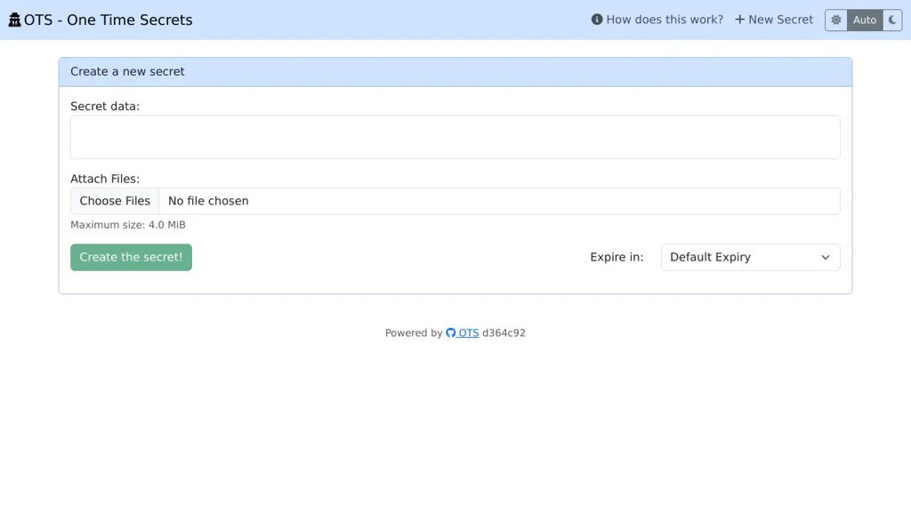 OTS provides a minimal, practical workflow for one-time sharing while reducing trust in the server by keeping encryption and decryption on the client. It is well-suited for teams and homelabs that need a lightweight, self-hosted alternative for sharing sensitive strings and small payloads.