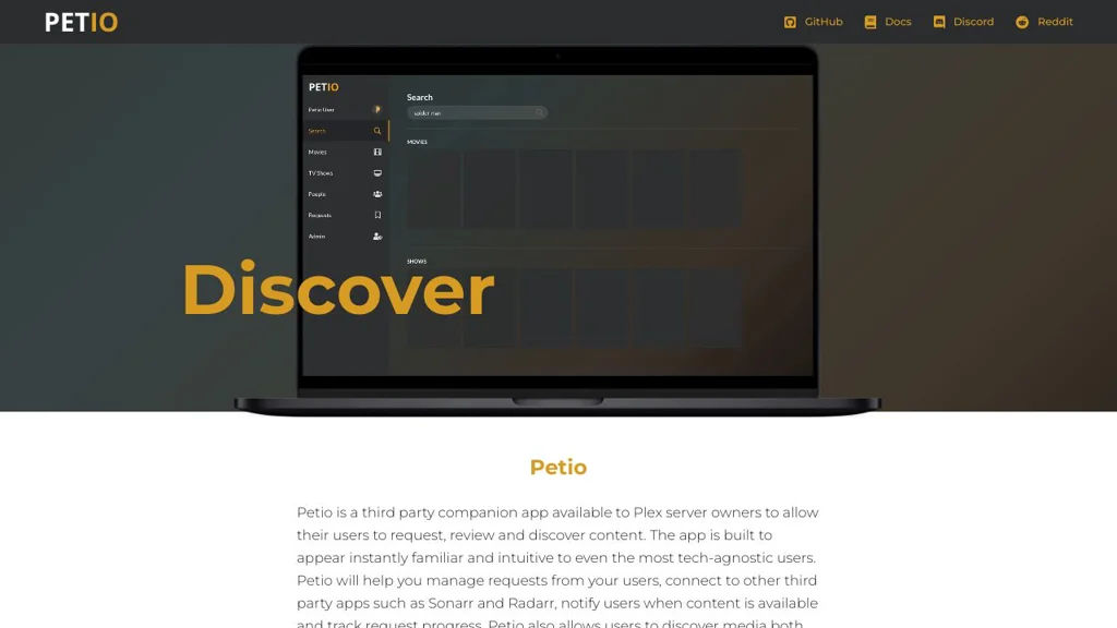 Petio is a web companion application for Plex server owners that enables users to request, discover and review media. It provides a familiar, user-focused interface for managing media requests, tracking progress, and surfacing related content from external sources.