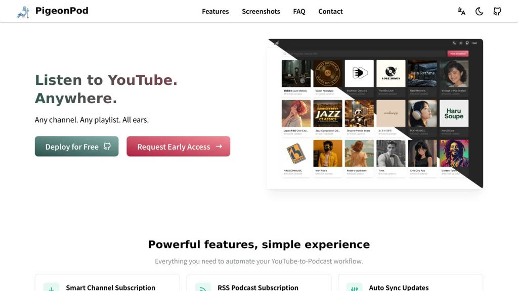 PigeonPod is a self-hosted service that turns YouTube channels and playlists into podcast-style RSS feeds you can subscribe to in any podcast app. It can automatically sync new uploads, download media to your server, and provide a web UI for managing feeds and playback.